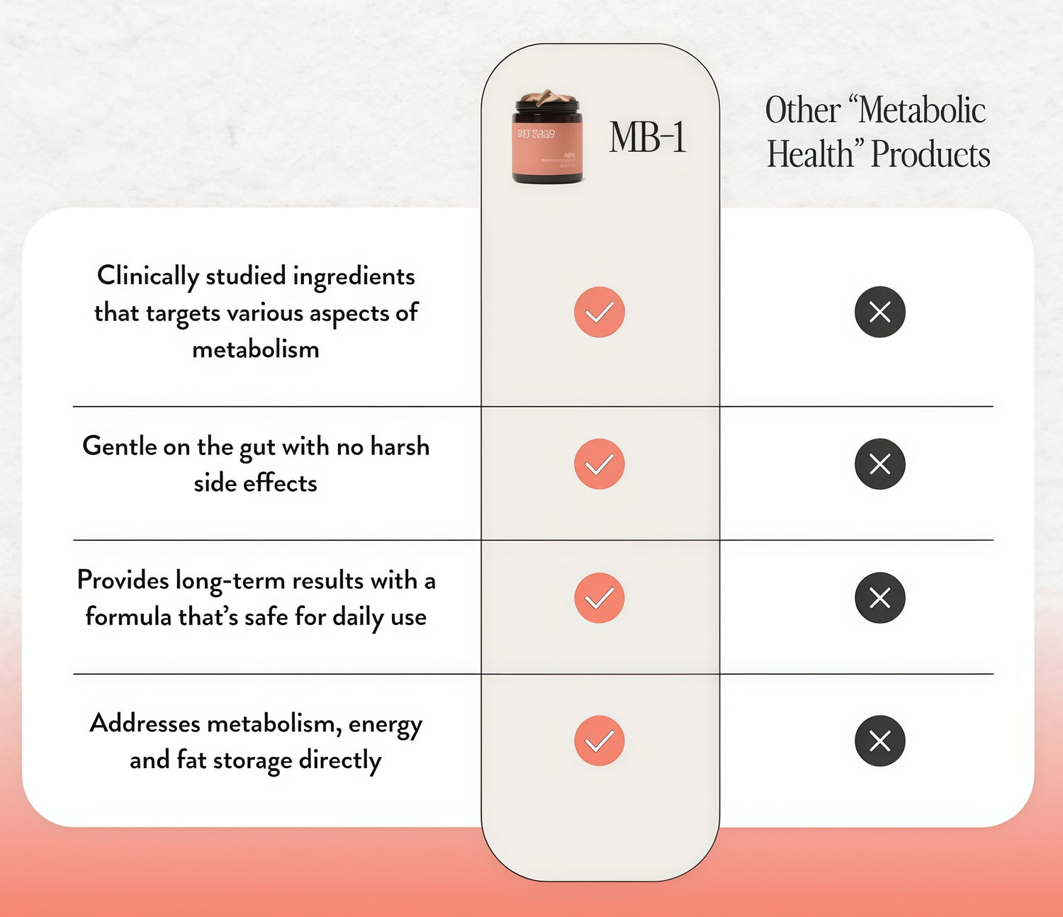 With countless products on the market, it can be hard to choose.MB-1 combines clinically studied ingredients that offer comprehensive metabolic support for real, measurable results without the guesswork. Achieve your health goals faster with 2 daily capsules that are safe for long-term use.